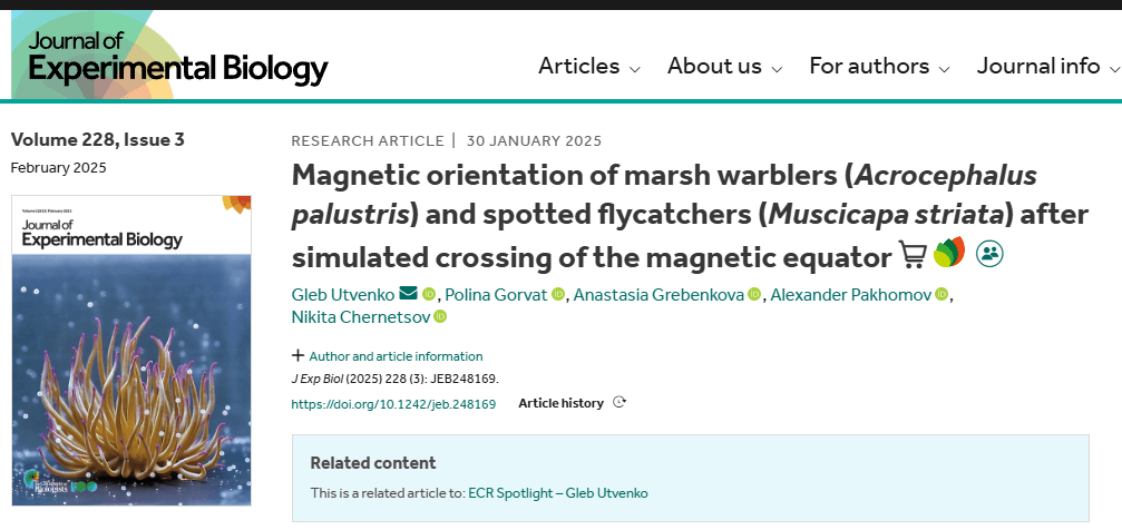 A new article about navigation of naive songbird migrants has been published in the Journal of Experimental Biology. In this study, we simulated the crossing of the magnetic equator for two trans-equatorial songbird species, marsh warblers and spotted flycatchers, by exposing them to a horizontal magnetic field.