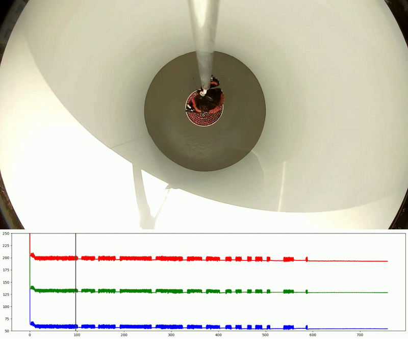Flight Chamber – A white plastic cylinder (45 cm in diameter, 50 cm in height) is placed vertically on a plastic/aluminium table. At the centre of the table, a 120-mm diameter 3D-printed plastic pipe (5), perforated with hundreds of 3-mm holes, create a laminar airflow (≤ 1 m/s). This airflow, generated by a PWM-controlled computer fan, is designed to stimulate tethered butterflies into active flight (Mouritsen & Frost, 2002). Most components are designed using Autodesk Fusion 360 for for fabrication via laser-cutting and 3D printing.