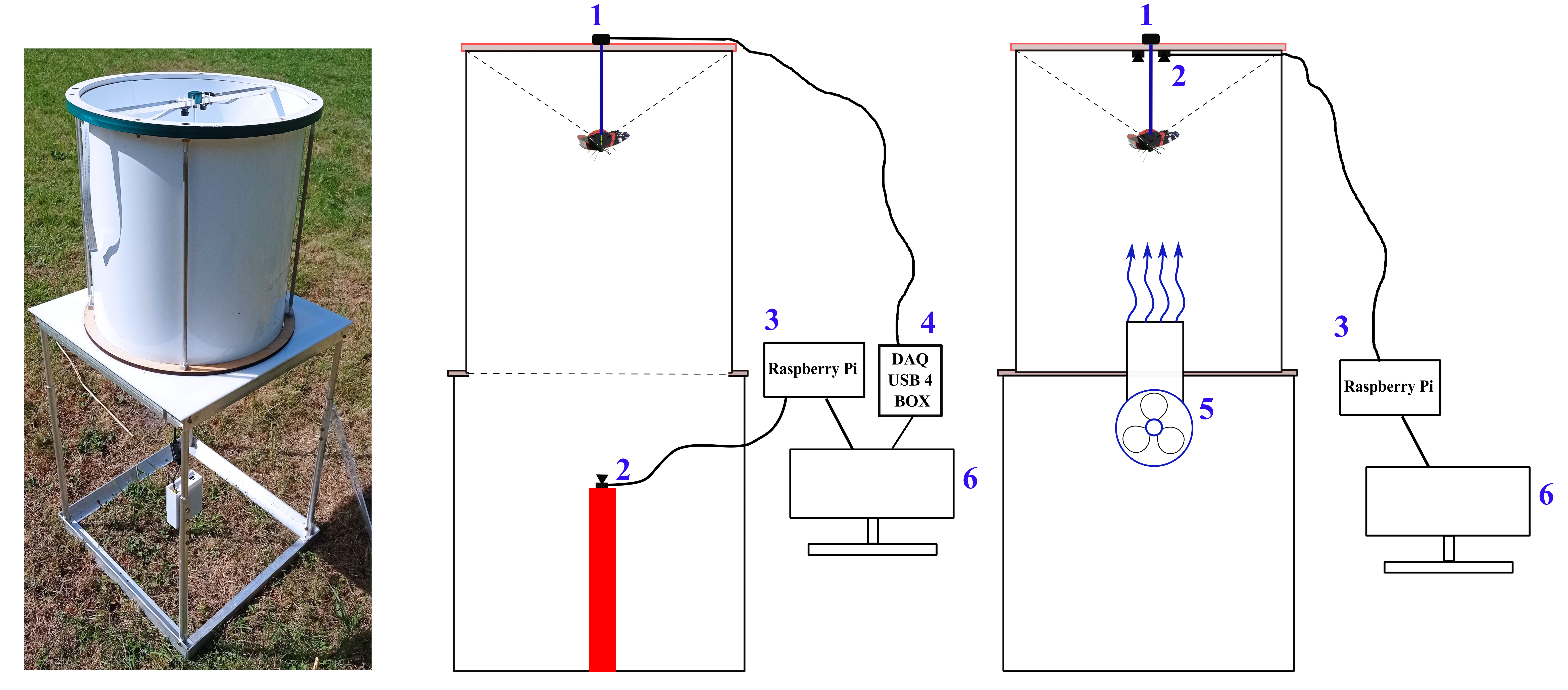 Two miniature video cameras (2; Waveshare Electronics, model H) are symmetrically positioned around the tungsten rod, with one capturing the butterflies’ behaviour from above. Using two cameras instead of one ensure a symmetrical environment within the flight simulator. A Raspberry Pi 4 single-board computer (3) connected to a laptop (6) is used for real-time monitoring of insect flight behaviour and to store raw video footage from each test for further analysis.
