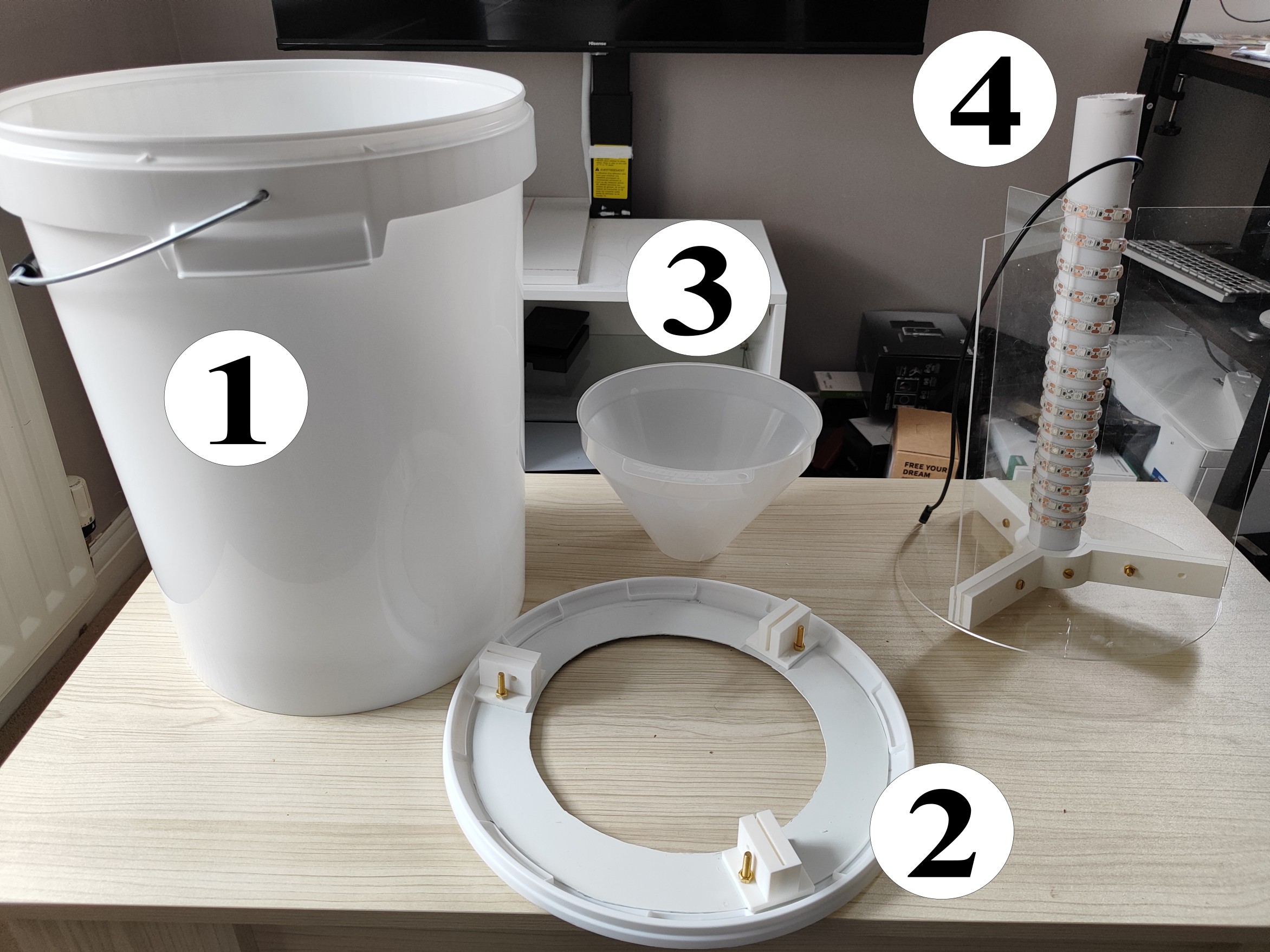 We used 27-litre bucket (1) for this design. However, any 25–30-litre bucket can be used for this purpose. Keep in mind that lightweight buckets may need to be secured to the ground or weighted down to prevent tipping.