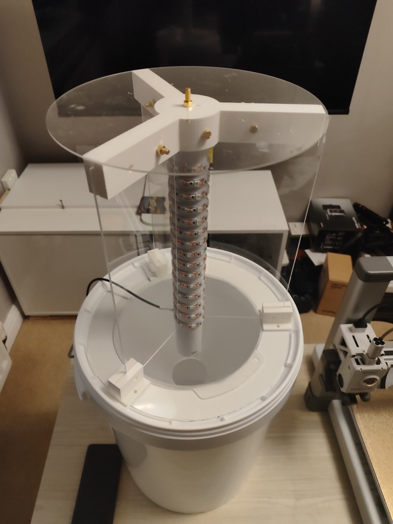 The upper part of the bracket is covered with a 25 cm circular acrylic plate, which serves as a rain shield. To stabilize the construction on the bucket, three 3D-printed holders are attached to the bucket lid (2).