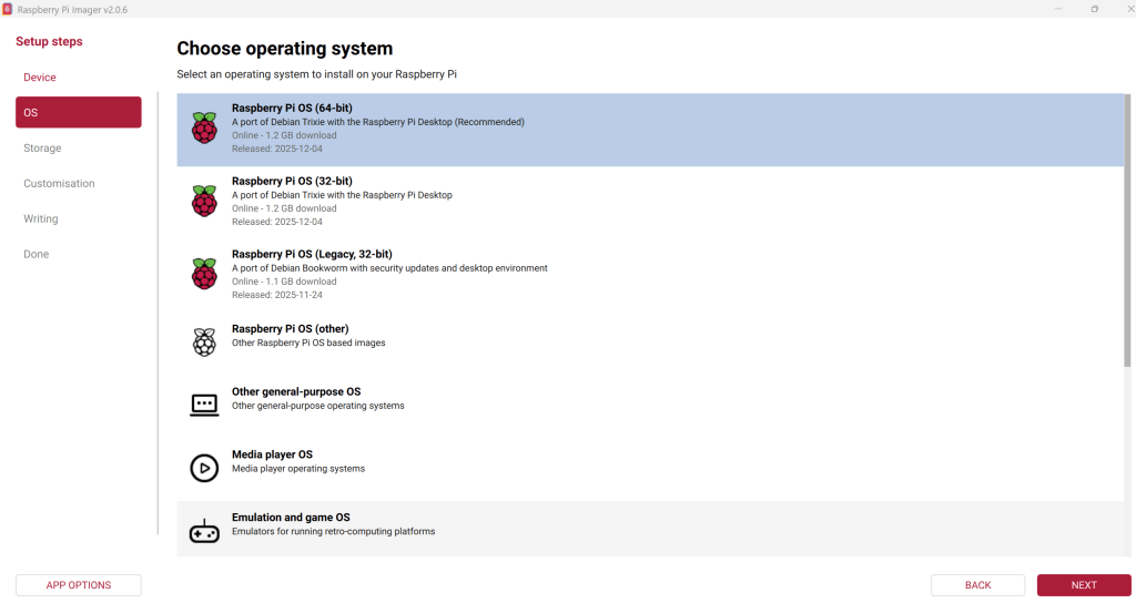 - Then select the operating system (Figure 2) and your storage device (SD card).