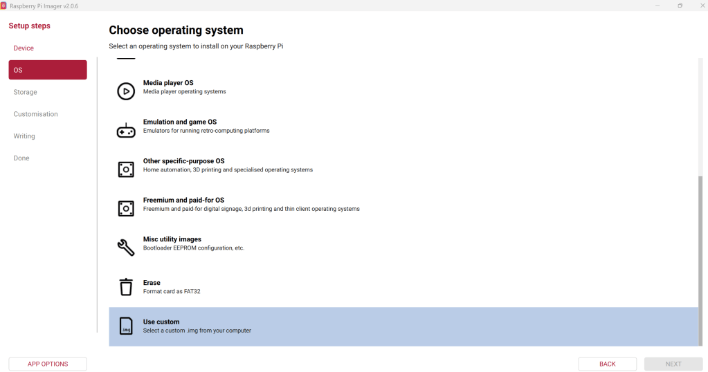 - You can select a custom pre-configured Raspberry Pi OS image instead of the official one if you already have a prepared OS image (figure 3)