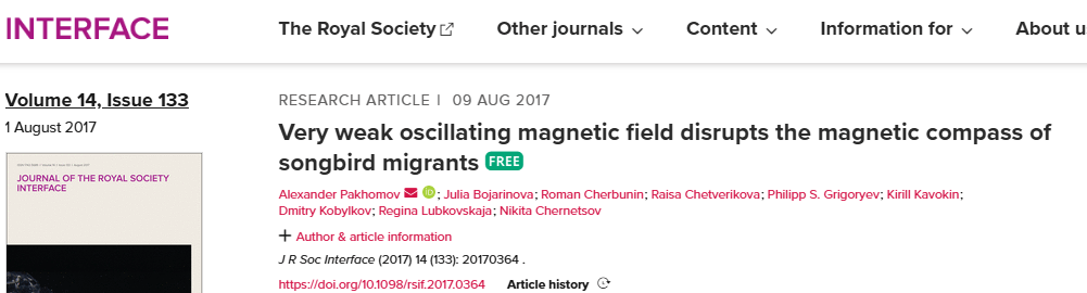 Very weak oscillating magnetic field disrupts the magnetic compass of songbird migrants (2017)